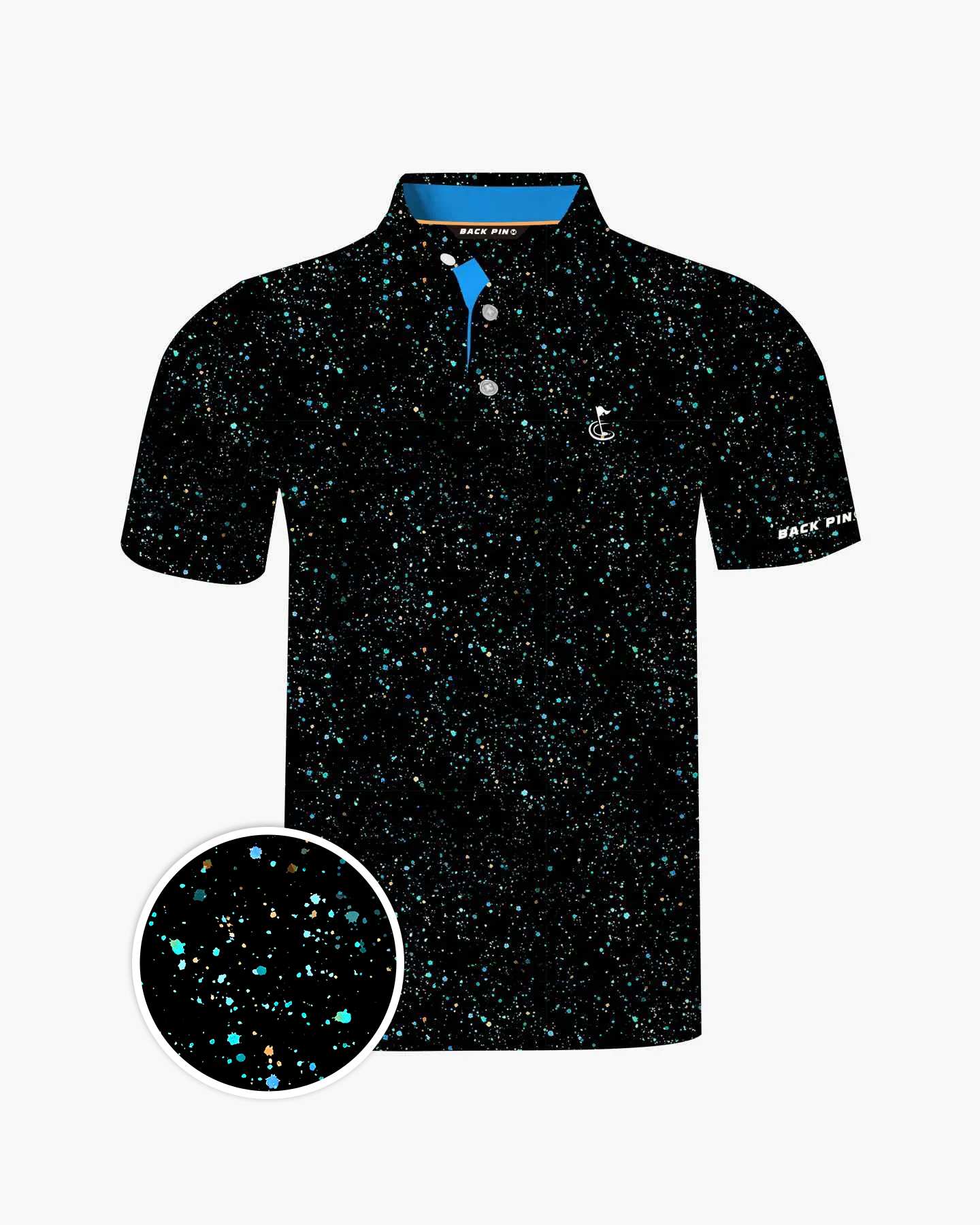 This stylish black polo shirt has a floral color that resembles a star splatter pattern, and it adds character and charm whether you're playing golf or going on vacation.
