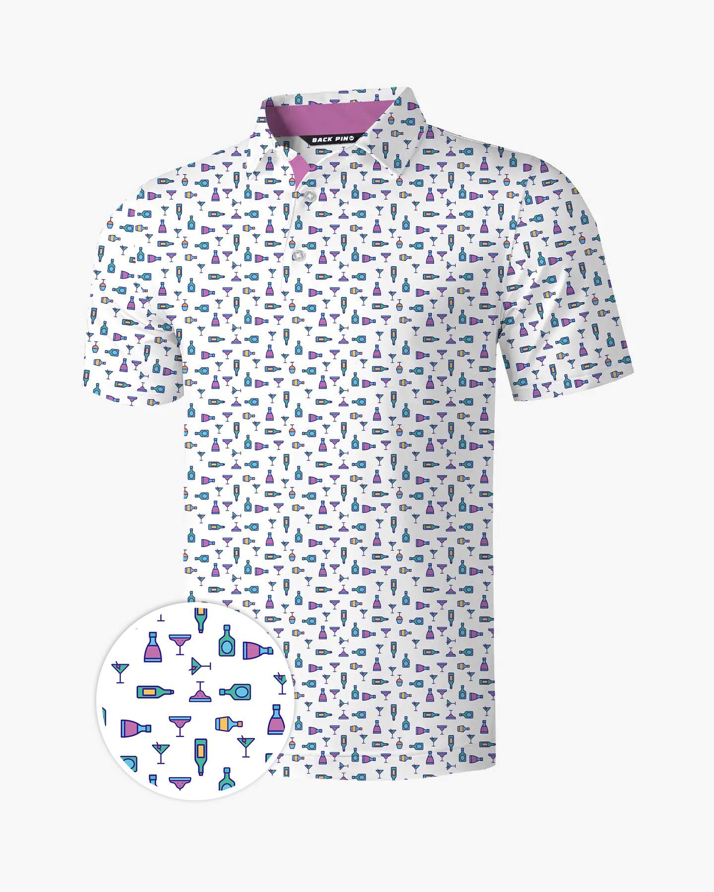 Enjoy both comfort and style with the party Transfusion 2.0 golf polo shirt. Crafted from premium fabric, it boasts an attractive print featuring creatively designed various small wine bottles and goblets against a crisp white background. This golf shirt offers excellent comfort, making it ideal for a day on the golf course, attending parties, or dating.