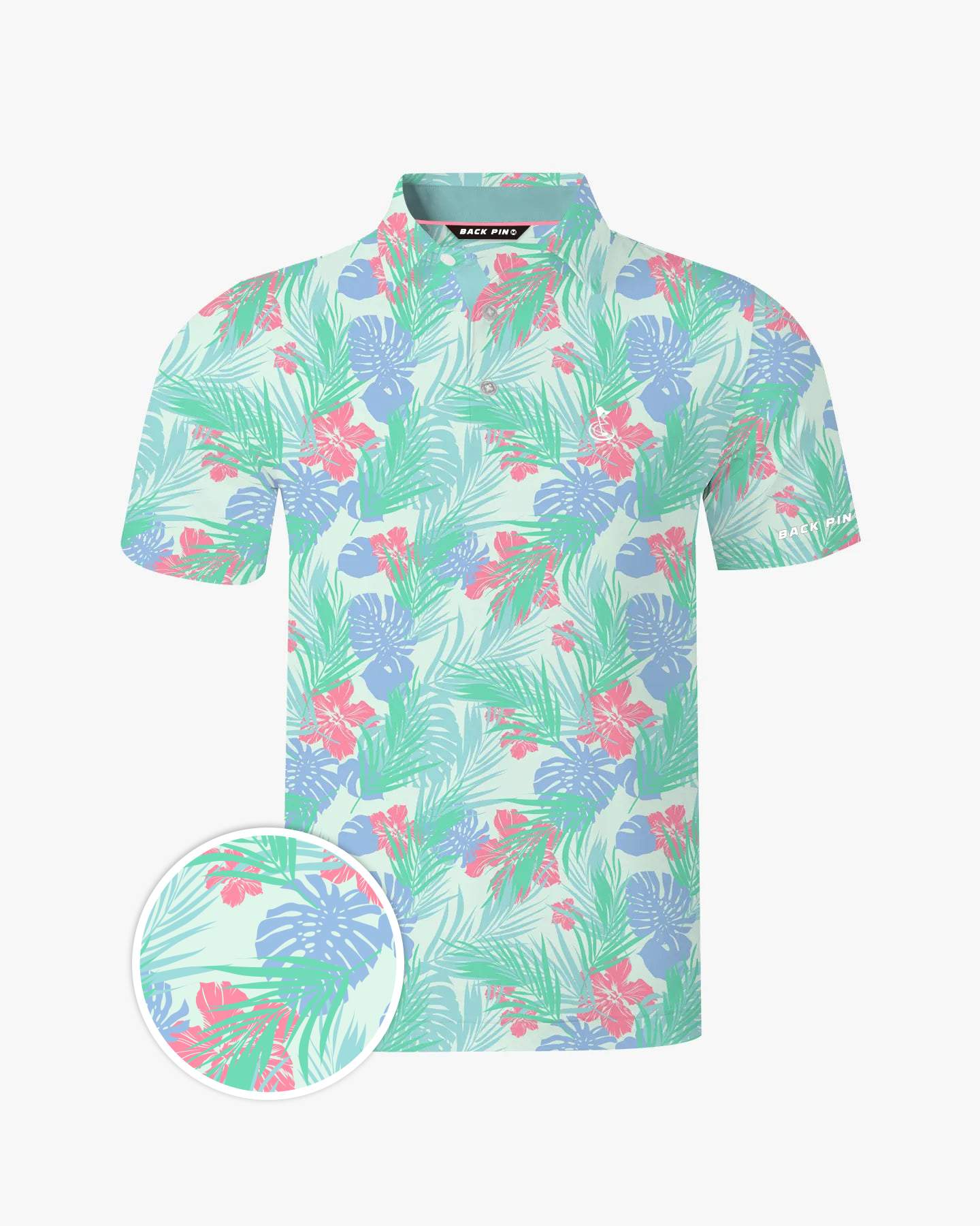 Slip into the Tropics Polo and drift into an endless summer. It’s like lounging in a beachside cottage, surrounded by soft, calming hues. Picture vibrant hibiscus flowers in full bloom and palm leaves swaying on a fresh, minty canvas—your little paradise.